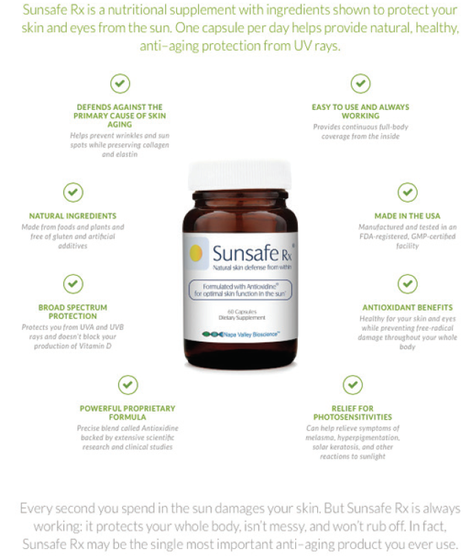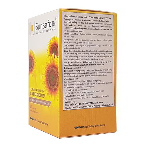 + Viên uống chống nắng toàn thân Sunsafe Rx* là sản phẩm chống nắng đột phá được sản xuất trên nền công nghệ mới của Mỹ, có khả năng chống nắng nhiều giờ liền và liên tục nhiều tháng. Sản phẩm thích hợp cho nhiều lứa tuổi.
