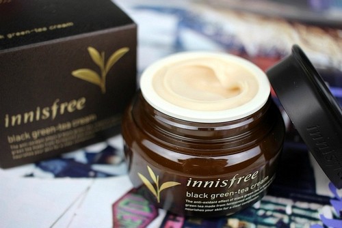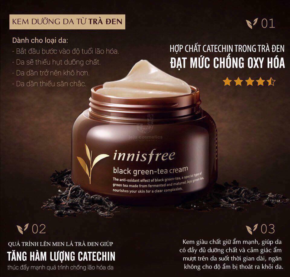 - Kem dưỡng da Innisfree Black Green Tea Cream có chứa 67,5% chiết xuất lá trà đen của đảo Jeju và độ tuổi nhất định thu hoạch 2 lần trong vòng 100 ngày.. Trong cream giàu dưỡng chất và chất chống oxy hóa dưỡng ẩm sâu cho da, giúp da mịn màng, săn chắc và khỏe mạnh hơn.