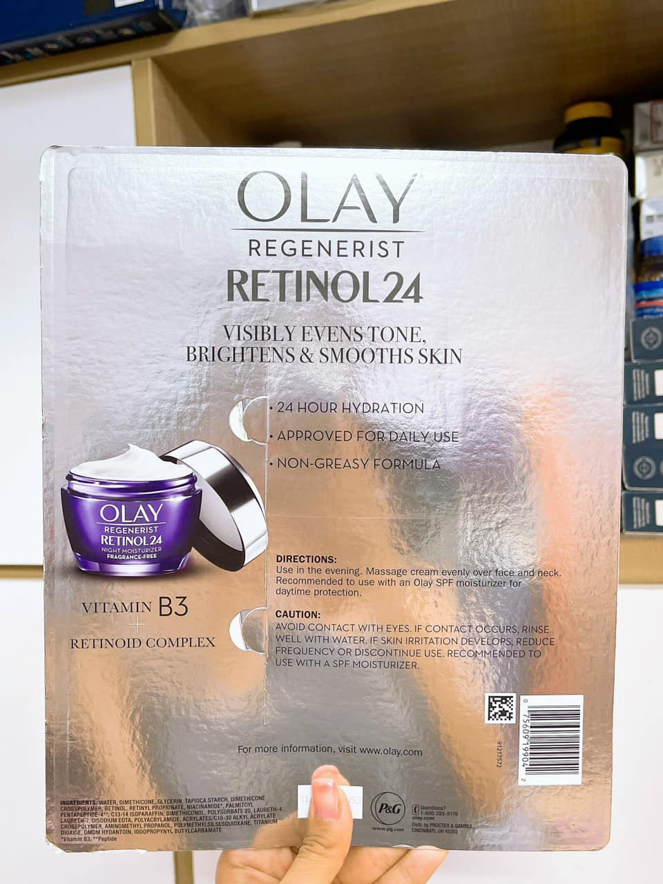 - Kem dưỡng da Olay Regenerist Retinol 24 Night Moisturizer là một dòng mới chuyên sâu ban đêm cung cấp độ ẩm suốt 24 giờ, ngăn chặn tình trạng da bị thiếu nước, khô sần. Đặc biệt, sự kết hợp của Vitamin B3 và Retinol giúp tái tạo tế bào, nuôi dưỡng chuyên sâu để da khỏe mạnh, căng bóng, rạng rỡ.