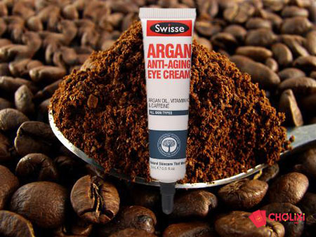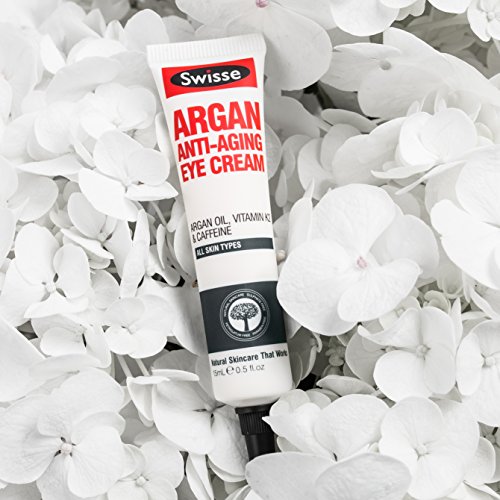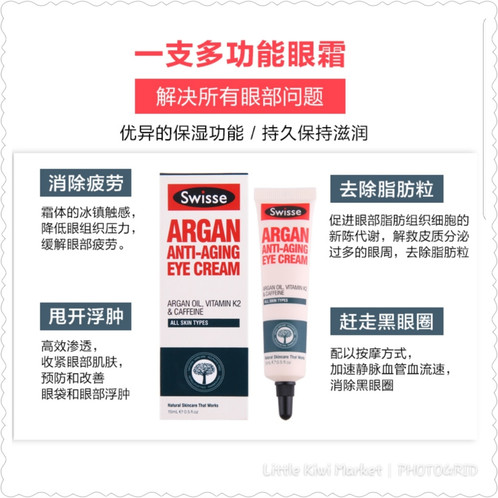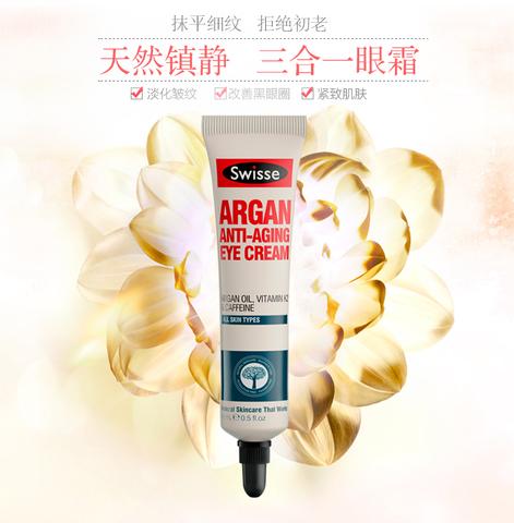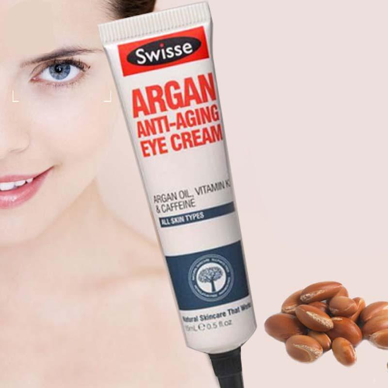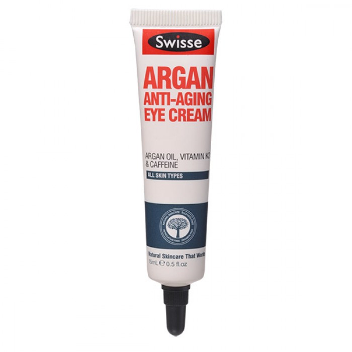 - Chức năng chính của bạn kem mắt này là giúp giảm nhăn, mờ thâm. Swisse Argan Anti-Aging Eye Cream có thành phần gồm dầu Argan, vitamin K12 giúp thu nhỏ, giảm thiểu quầng thâm, cùng với các hoạt chất caffeine và guarana giúp săn chắc, nâng cơ và làm mờ vết nhăn vùng mắt.