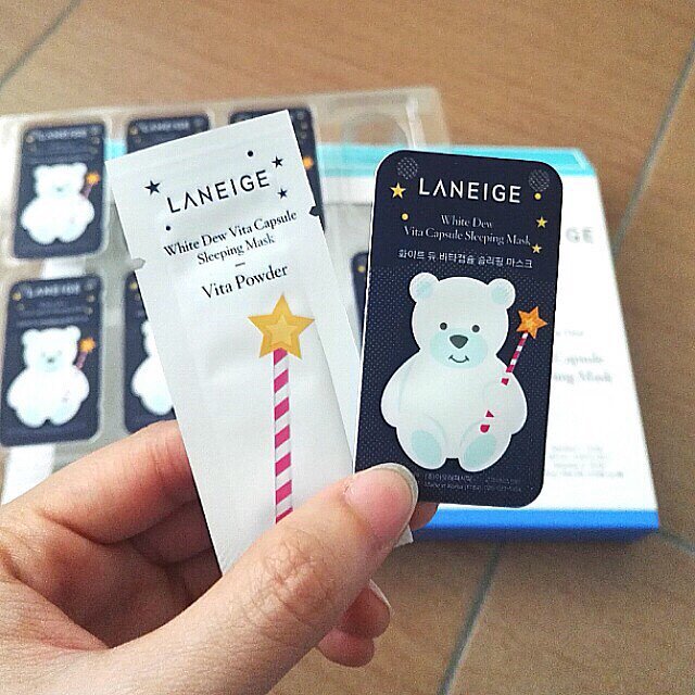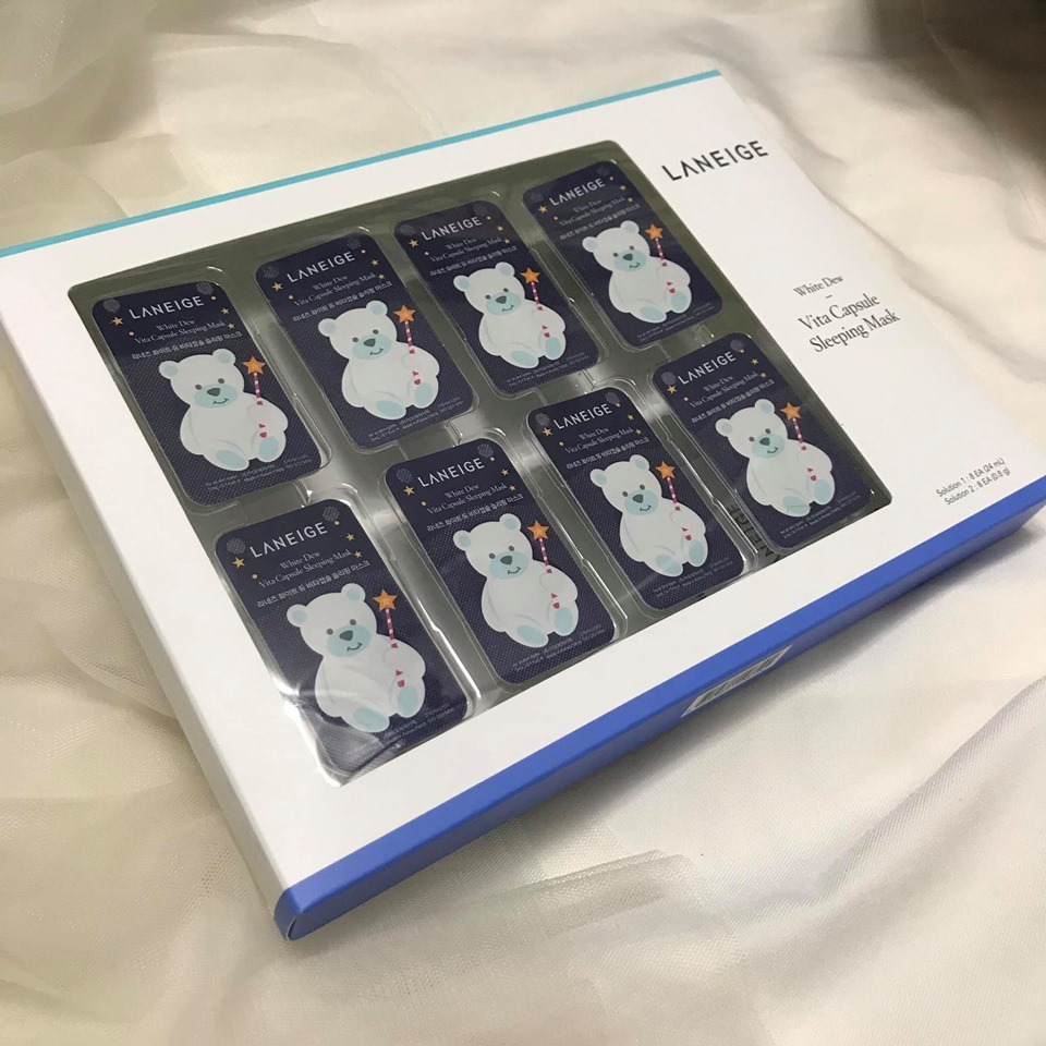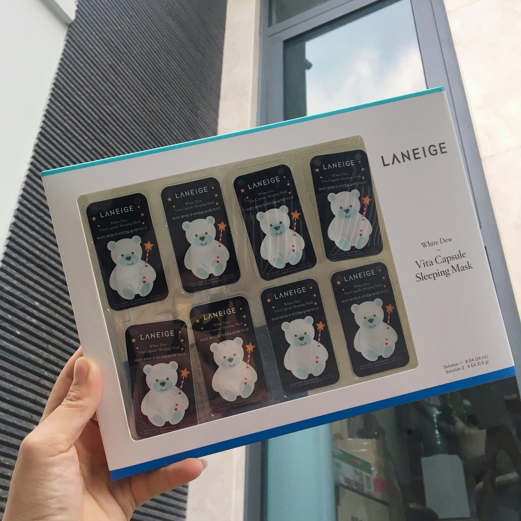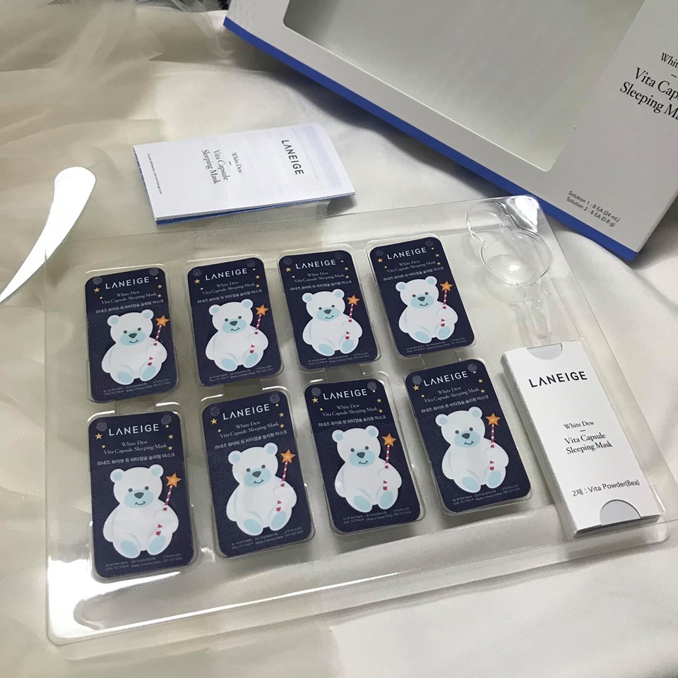 - Mặt Nạ Ngủ Gấu Con Laneige White Dew Vita Capsule Sleeping Mask được đóng gói riêng lẻ với 16 gói có thể sử dụng tới 2 tháng (khoảng 8 tuần) khi dùng 1 tuần 2 lần.