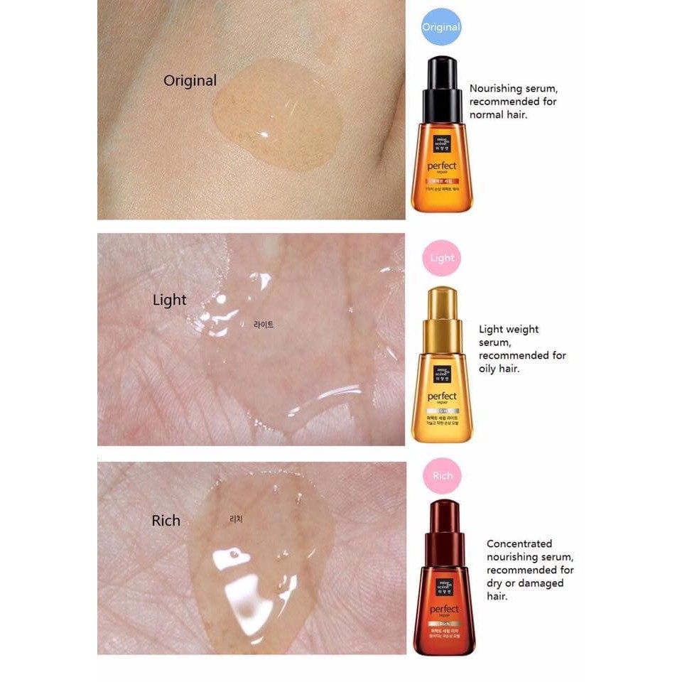 #3 - Tinh chất dưỡng tóc dành cho tóc dầu Aritaum Mise En Scène Damage Hair Care Perfect Serum Light: kết cấu lỏng nhẹ nhất, phù hợp với tóc dầu, tóc hư tổn nhẹ, hương hoa cỏ dịu dàng.