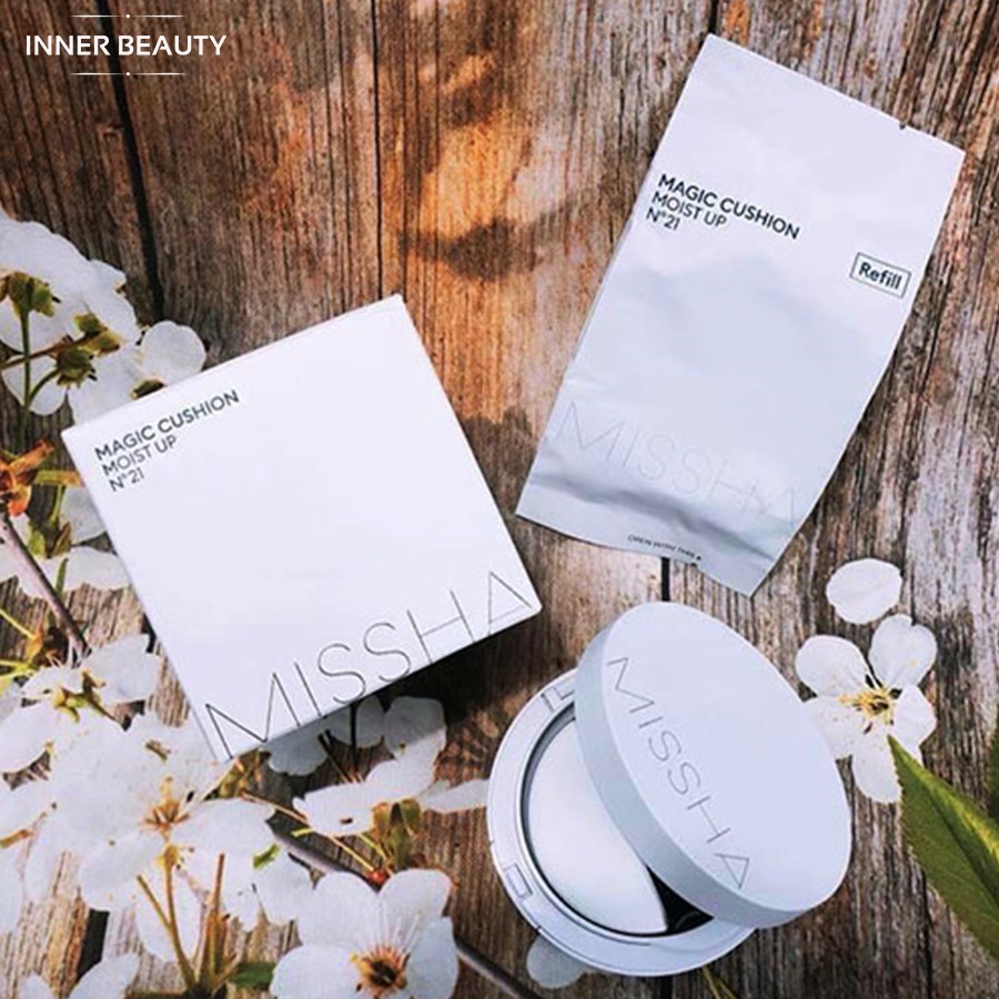 - Phấn Nước Dưỡng Ẩm Giúp Da Bóng Khỏe Tự Nhiên Missha Magic Cushion Moist Up SPF50+ PA+++ có kết cấu kem mềm mịn, mỏng nhẹ dễ dàng tệp vào da tạo hiệu ứng mịn màng tự nhiên, hoàn toàn không gây nặng mặt hay bí bít da.