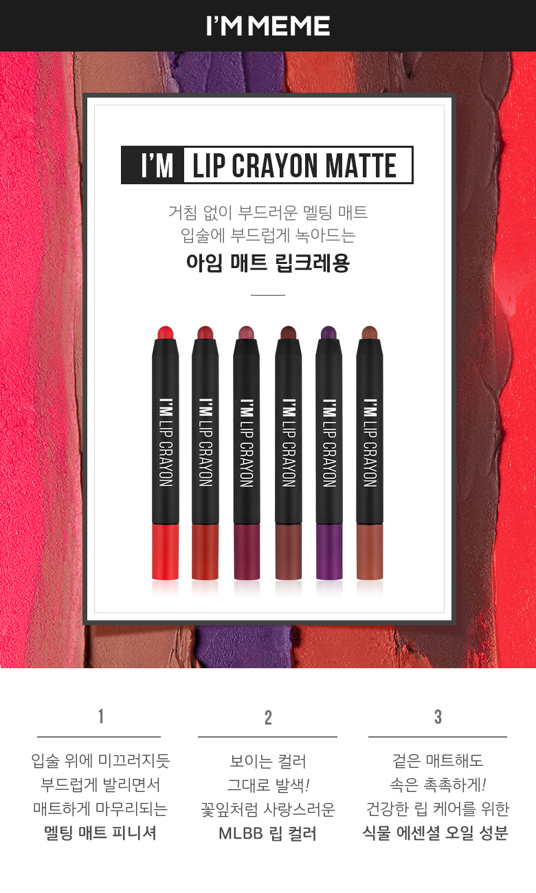 Son dạng bút chì vặn Memebox I'm Lip Crayon Matte là dòng son của riêng Memebox dạng bút chì vặn, màu son lên môi rất mướt và lì, màu sắc tươi tắn thích hợp với mọi màu da, chất son đẹp lên đều màu.