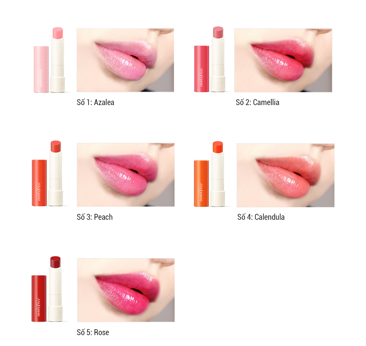 - Đây là một 1 thỏi son dưỡng môi đầu tiên của Innisfree có chứa 2 công dụng trong 1: Thứ nhất là khả năng lên màu vivid tint cực đẹp lấy cảm hứng từ màu sắc của từng cánh hoa và thứ công dụng thứ hai là lần đầu tiên 1 thỏi son tint chứa đựng thành phần dưỡng môi đáng kinh ngạc, bao gồm rosehip oil, rose water và acacia collagen phục hồi làn môi thâm, nứt nẻ một cách hoàn hảo