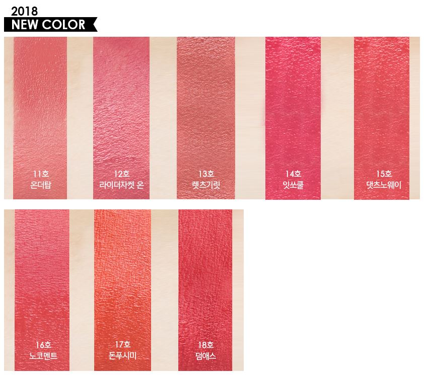 - Bảng màu son gồm 18 màu đa dạng từ cam, hồng, đỏ đến tone đất thời thượng phù hợp với mọi tone da. Trong đó gồm 10 màu mới ra mắt vào năm 2019 và 8 màu ra mắt vào năm 2018.