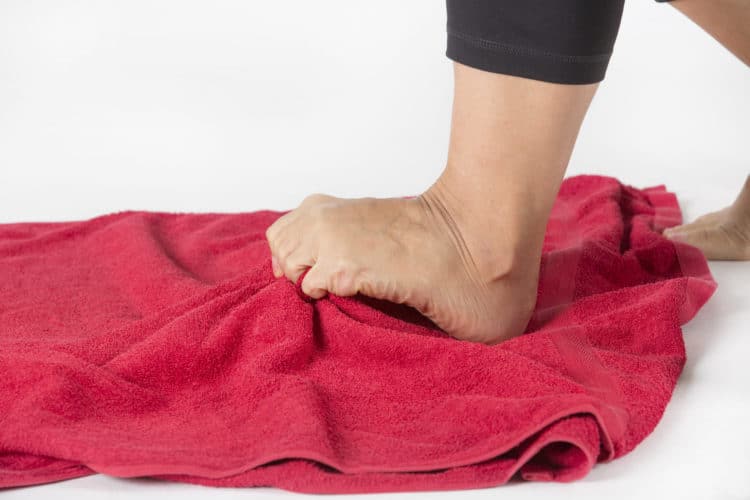 Một bài tập đơn giản và đem đến hiệu quả cao trong việc chăm sóc bàn chân sau khi mang giày cao gót chính là gắp khăn. Bạn dùng một chiếc khăn trải trên nền nhà rồi dùng vác ngón chân gắp lấy rồi thả ra. Cứ gắp thả trong vòng 30 giây lặp lại 3 lần ở một bên chân rồi đổi chân. Lúc này, các ngón chân của bạn sẽ được thư giãn, giúp lấy lại thăng bằng và làm giảm đi tác dụng khi bị dồn nén lực xuống bàn chân quá lâu khi đi giày cao gót.