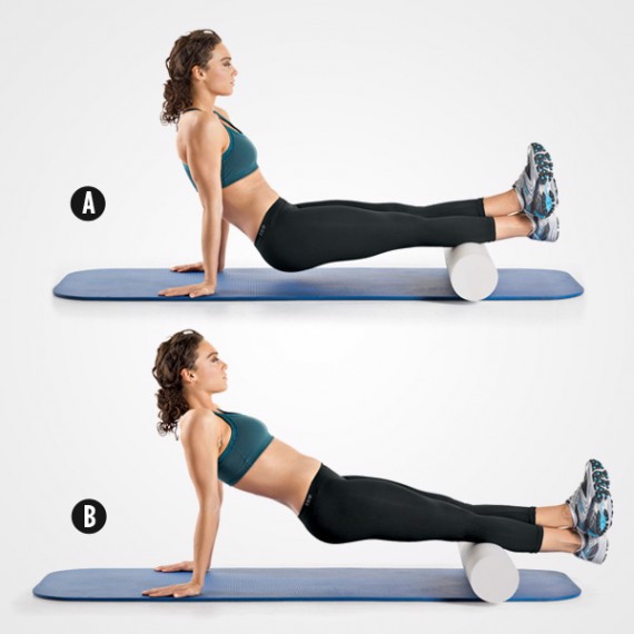 Bạn ngồi trên sàn nhà rồi duỗi thẳng 2 chân đồng thời đặt tay phía sau sàn nhà. Sau đó, đặt một con lăn dưới mắt cá chân rồi nâng mông lên khoảng 5 cm so với sàn nhà. Đẩy cơ thể từ từ chuyển động về phía trước rồi tiếp tục lăn lên xuống bắp chân. Thực hiện trong khoảng 2 - 3 phút cho mỗi bên.