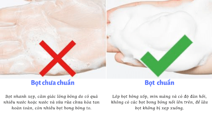 Bọt chuẩn sẽ có độ bông xốp, mịn màng, có độ đàn hồi tốt, khi để lâu thì vẫn không bị xẹp. Bên cạnh đó bọt chuẩn sẽ không có quá nhiều bong bóng to nổi lên trên. Nếu thấy bọt nhanh xẹp, có nhiều bong bóng to nổi lên trên và cảm giác vẫn còn lõng bõng thì nghĩa là chúng ta tạo bọt chưa chuẩn nhé.