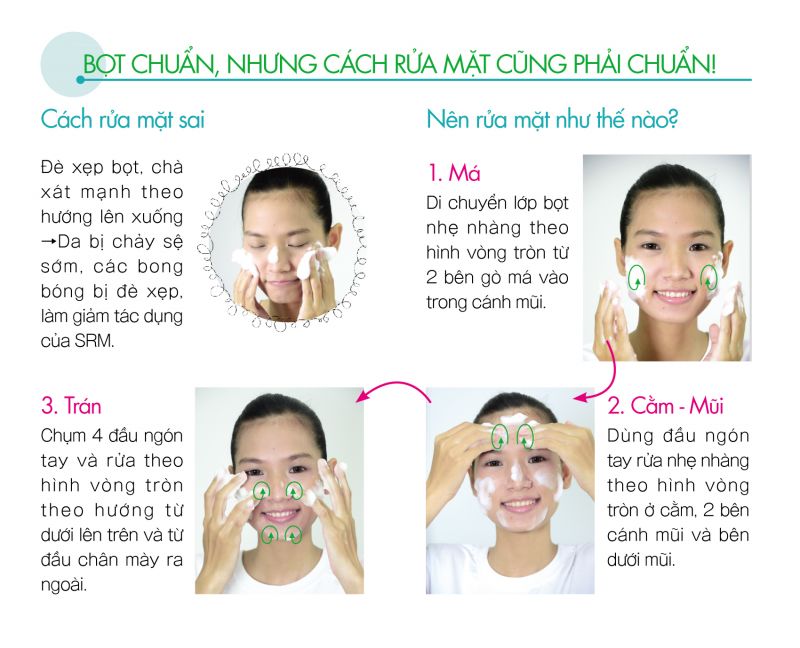 Nhẹ nhàng áp lớp bọt lên mặt theo hướng từ cằm lên má, di chuyển lớp bọt nhẹ nhàng theo hình vòng tròn từ 2 bên gì má vào cánh mũi, lưu ý là phải massage tròn theo chiều kim đồng hồ, mở rộng dần dần để tạo những cơn lốc nhỏ cuốn đi những bụi bẩn, chất nhờn bám trên da.