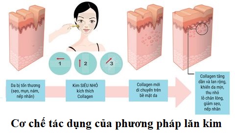 - Lăn kim là phương pháp dùng các mũi kim nhỏ trên máy lăn tác động trực tiếp lên da để tạo ra các vết thương giả. Kích cỡ mũi kim được chỉ định tùy theo tình trạng da và được làm bằng loại thép không gỉ trong y khoa. Sau khi lăn xong, cơ chế làm lành sẽ được kích hoạt, sản sinh tế bào mới hình thành lớp collagen và elastin mới khỏe hơn.