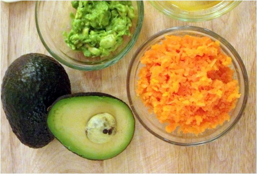 - Nghiền nát phần thịt bơ và đu đủ rồi trộn lại thành hỗn hợp sền sệt.
