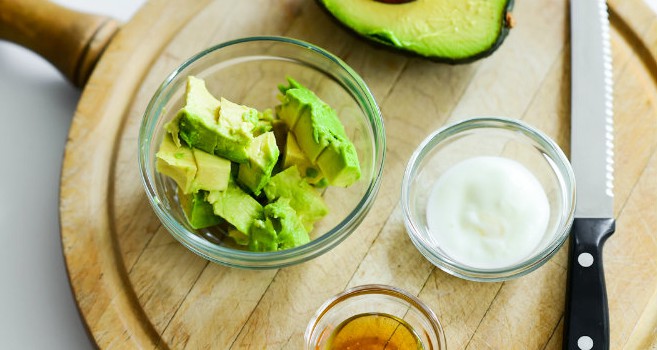- Trộn ½ quả bơ đã nghiền sẵn với 2 muỗng canh mật ong nguyên chất