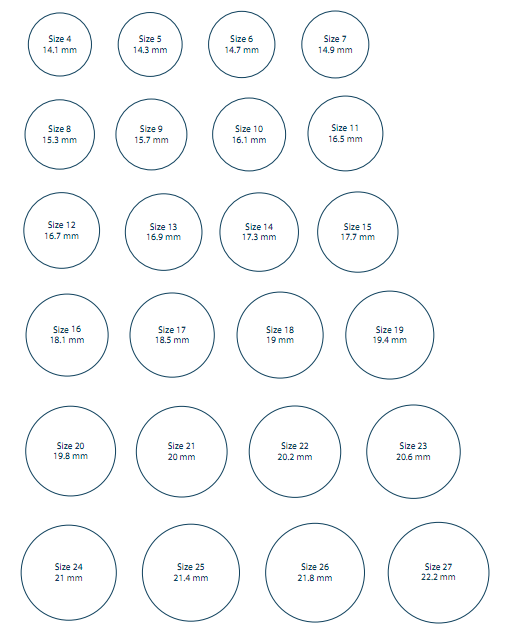 Bạn có thể tự ước lượng size nhẫn của mình bằng cách đo đường kính lòng trong của chiếc nhẫn vừa nhất với bạn. Đường kính lòng trong của nhẫn sẽ tương ứng với size nhẫn tương ứng (bảng quy chiếu ở bên dưới).
