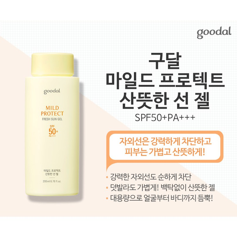 Kem chống nắng vật lý Goodal Mild Protect Fresh Sun Gel - 1 loại kem chống nắng vật lý có thể bôi đi bôi lại nhiều lần mà không hề bị bí tắc da, không vệt trắng để lại, cảm giác thoáng, dễ chịu.