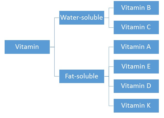 Ở người có 13 loại vitamin: 4 tan trong chất béo (A, D, E và K) và 9 tan trong nước (8 vitamin B và vitamin C). Các vitamin tan trong nước dễ dàng hòa tan trong nước và nói chung là dễ dàng đào thải ra khỏi cơ thể, đến mức mà lượng nước tiểu là một yếu tố dự báo mạnh mẽ về tiêu thụ vitamin.